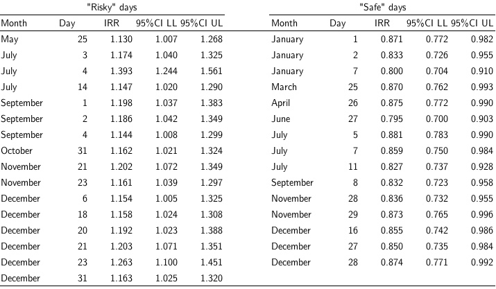 There is quite a lot of noise in these daily crash rate ratios, and few that appear reliably above or below the rates +/- one week. Although accounting for overdispersion leads to estimates for 4/20 that are not statistically distinguishable from the null (a distinction that we don’t think is meaningful), apparently there are several other days to worry about (excess deaths) and/or celebrate (reduced deaths):