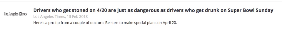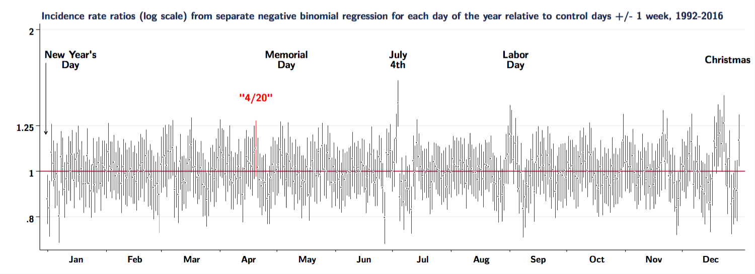 -Staples JA, Redelmeier DA. The April 20 Cannabis Celebration and Fatal Traffic Crashes in the United States JAMA Int Med, Feb 18, 2018, p.E2