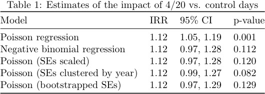 These issues (overdispersion, clustering) are relevant to the 4/20 problem, so we used the same Fatal Analysis Reporting System (FARS) dataset (restricted to drivers and the same time of day) to see whether accounting for additional variation in daily traffic crashes would provide alternative estimates of precision. Not surprisingly, it does. First, it’s easy to show that the tabular estimate is identical to what you get using Poisson regression (beta=0.11, se=0.034, IRR=1.12, 95%CI 1.05, 1.19). Then one can correct for overdispersion and/or extra-Poisson variation a few different ways: