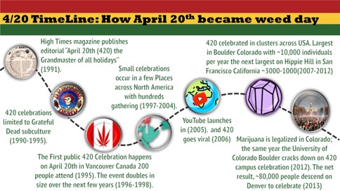 The authors defined 4/20 celebrations as having started in 1992, claiming that 4/20 events were popularized as a consequence of High Times magazine publishing a 1991 editorial declaring, “the grandmaster of all holidays: 4/20, or April 20th” (see timeline below). However, there is evidence that the first 4/20 celebration in the US did not occur until 1997 and was limited to Hippie Hill San Francisco with a few thousand people in attendance (some interesting history here, here, and here). The large 4/20 celebrations seen more recently (e.g., the last 5 years) are likely due to a combination of legalization of recreational use in certain areas (Colorado, Washington, etc.), wider societal acceptance, and the growth of the cannabis market into a lucrative industry.