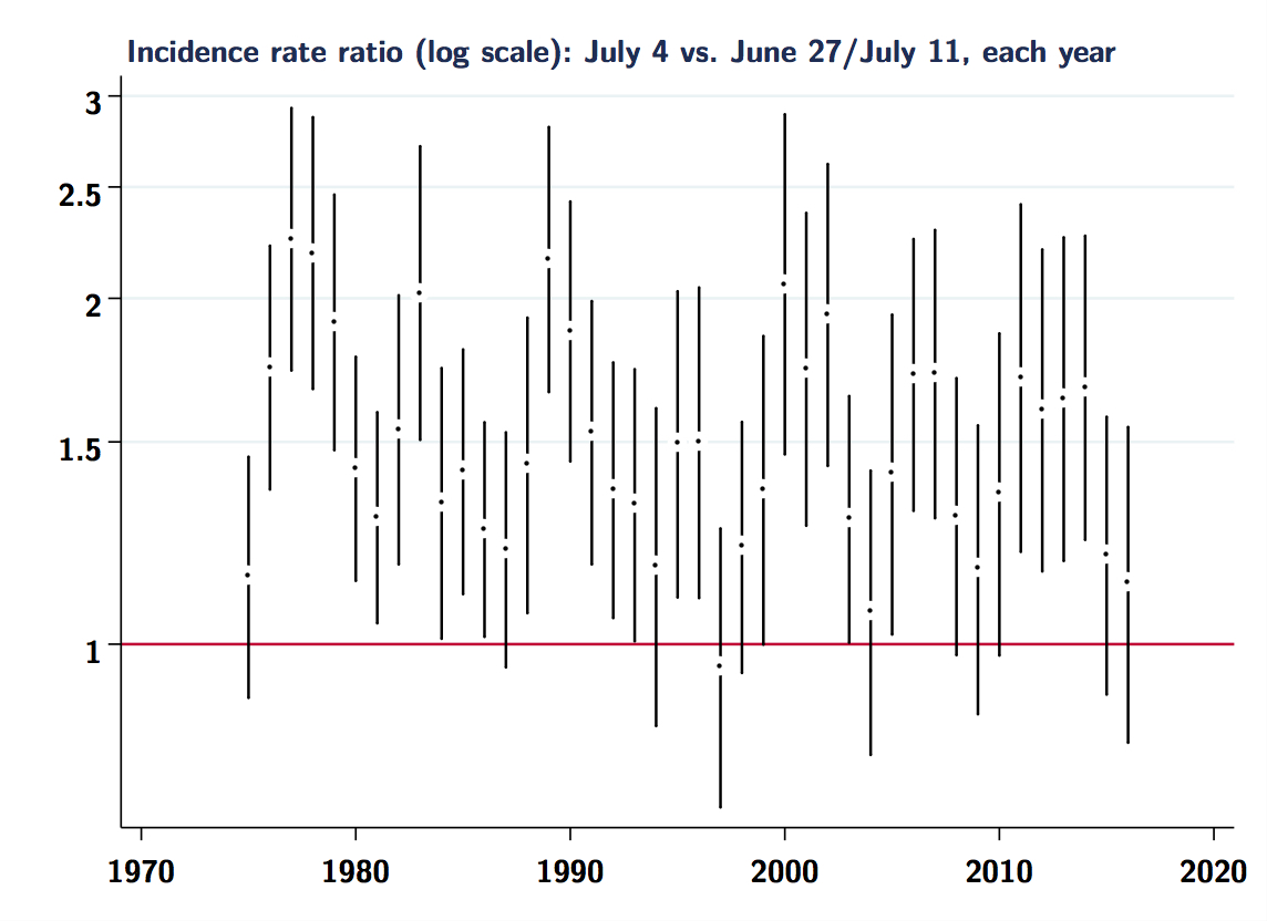 title("Incidence rate ratio (log scale): July 4 vs. June 27/July 11, each year", pos(11) ///
